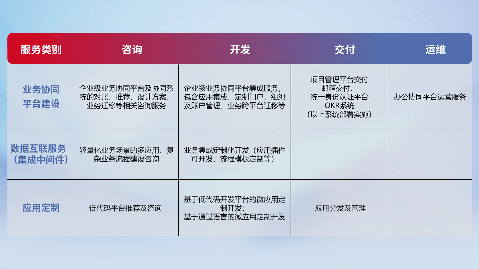 针对钉钉、、、企微、、IDaas等平台级产品提供产品的规划、、、、方案、、、交付、、、、定制化开发等服务,,实现如统一协同办公、、、智能客户服务、、、、混合会议管理、、智能数据查询、、、等业务场景,,,实现数字化转型。。。